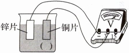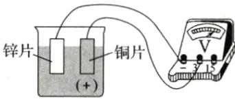 6. (电压表的使用)如图所示,将铜片和锌片浸入盐水中,制成一个“盐水电池”,观察到电压表指针向右偏转,请用“+”或“-”在铜片下方的括号内表示出“盐水电池”此端的极性。