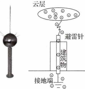 12. (跨学科·日常生活)(2024秋·太原期中)如图所示为某种家用避雷针及其安装示意图。避雷针工作时,如果带负电的云层靠近建筑物时,云层会放出白色电弧直劈向避雷针,避雷针将云层的负电荷导入大地,使得建筑物不会受到任何影响。带电的云层向避雷针放电时,下列有关说法正确的是 (