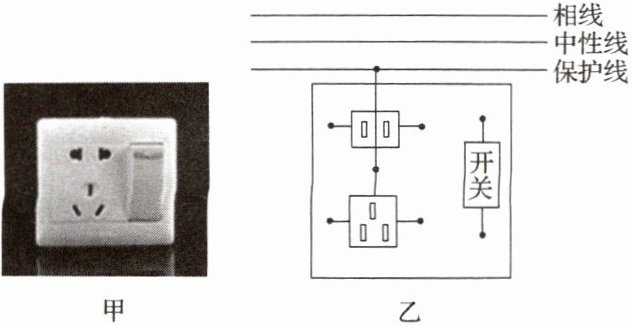 6. (家庭电路的连线作图)如图甲为带开关的插座,开关断开后,所有插孔均不能提供工作电压。请在图乙中将其正确地连入家庭电路。