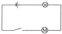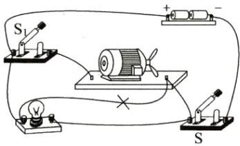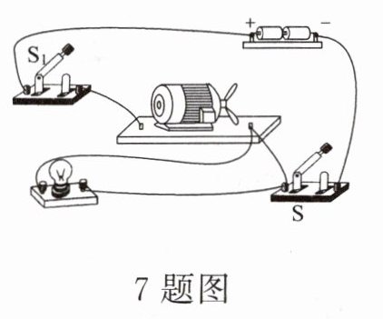 7.在如图所示电路中,有一根导线连接错误,请将错误导线用“×”标出,并画出正确连接方式。要求:改正后,灯泡和电动机并联,开关S控制所有用电器$,S_1$只控制电动机。