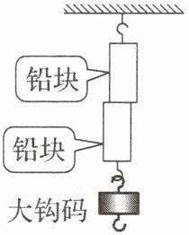 2. (认识分子间的作用力)把两铅块表面削平、削干净,然后把它们紧紧地压在一起,两个铅块就会结合起来,甚至还能吊起一个大钩码,如图所示。在压紧的过程中,两个铅块表面的分子间的距离______(选填“变大”“不变”或“变小”),由于铅块分子间产生较大的______(选填“引力”或“斥力”),使得两铅块没有分开。