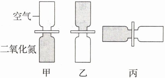 6. (探究气体扩散)如图,将两个分别装有空气和红棕色二氧化氮气体($\rho_{二氧化氮}>\rho_{空气}$)的玻璃瓶口对口对接,中间用玻璃板隔开。抽开隔板后,保持两瓶口紧贴静置较长时间后,两瓶中气体颜色变得相同。此现象说明______,对于玻璃瓶的三种放置方法(如图所示),你认为图______放置最不合理。