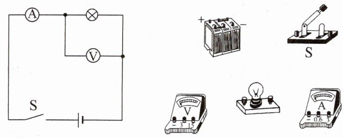 9. 如图所示,请根据电路图连接实物图。已知电源电压为 6 V,通过小灯泡的电流为 1 A。