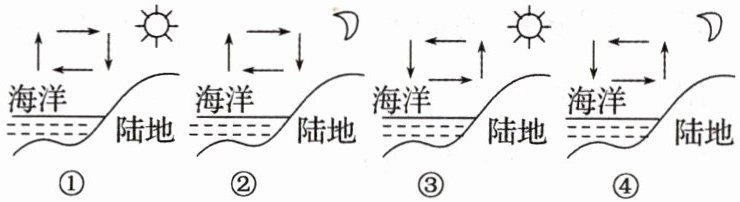B 由于地面和海水的比热容不同,海水的比热容大于陆地的比热容,在同样太阳光的照射下,地面与大海升温和降温的快慢不同,从而使空气形成对流。白天,地面比大海升温快,地面热空气密度较小,热空气上升,海面较冷的空气就会来补充,于是冷空气沿海面吹向陆地,形成海风,故③是海风;晚上,地面比大海降温快,海面热空气密度较小,热空气上升,地面较冷的空气就会来补充,于是冷空气沿陆地吹向海面,形成陆风,故②是陆风。