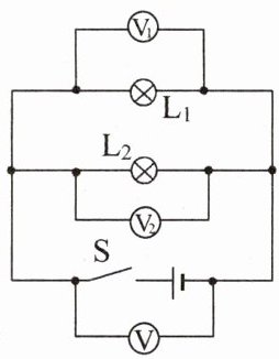 (1)设计实验:如图为两个灯泡并联的电路图,用电压表分别测量两个灯泡$L_1、$$L_2$以及电源两端的电压。
