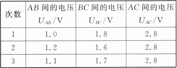 (选填“串联”或“并联”)。(2)正确实验后,数据记录如表,AB、BC、AC间的电压U_{AB}、U_{BC}、U_{AC}正确的关系是