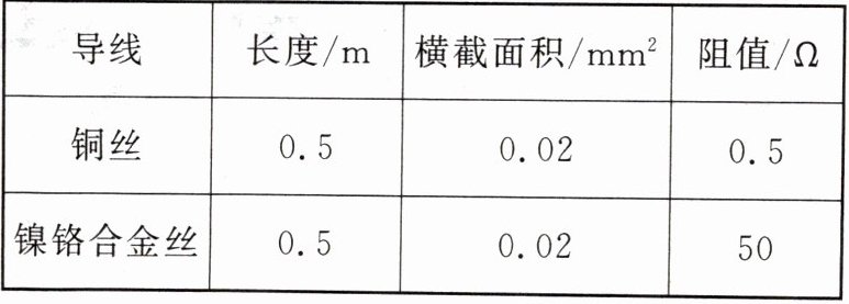 (选填“铜丝”或“镍铬合金丝”)更合适。| 导线 | 长度/m | 横截面积$/mm^2 $| 阻值/Ω |