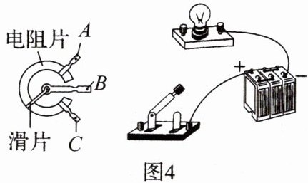 如图4,请选择电位器A、B、C三个接线端其中的两个连入电路中,要求顺时针旋转滑片时,灯泡变暗。