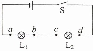 1.(2025·福州期中)如图所示为小华连接的电路,他检查导线连接无误后,闭合开关S,发现两灯均不发光,于是他用一根导线分别连接到ab和bc两点,灯$L_1$和$L_2$均不发光;再用导线连接到cd两点时,灯$L_1$发光$,L_2$不发光。由此判定电路的故障是 (