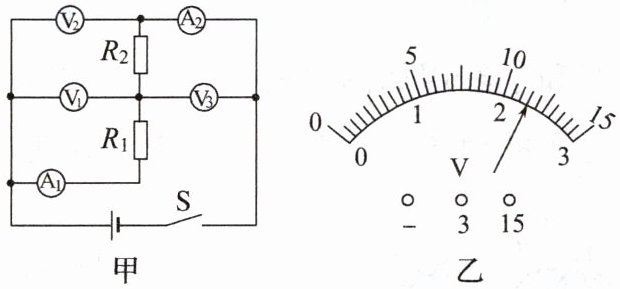 4.(2025·潍坊期末)如图甲所示的电路中,当开关S闭合时,电压表$V_1、$$V_2、$$V_3$的示数分别为$U_1、$$U_2、$$U_3,$电流表$A_1、$$A_2$的示数分别为$I_1$和$I_2($五块电表的读数均不为零),其中$V_2、$$V_3$两个电压表指针偏转均如图乙所示,下列结论正确的是(