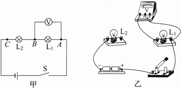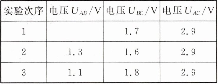 (3)用电压表分别测出电压U_AB、U_BC和U_AC。其中测U_AB时,电压表的示数如图丙所示,示数为 V。接着更换不同规格的灯泡并多次实验,数据记录见表。