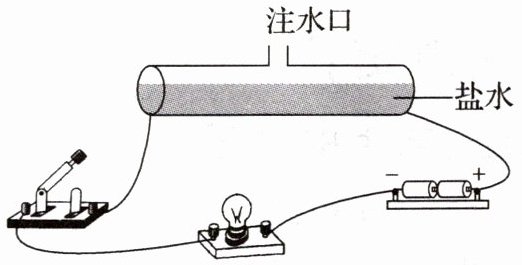 8.(2025·潍坊质检)如图所示,把两端接有金属接线柱的塑料管、电源、开关、小灯泡用导线组装成串联电路,闭合开关后,将适量浓度均匀的盐水从注水口慢慢倒入塑料管中时,发现注入的盐水越多,灯泡越亮,可以说明电阻大小和