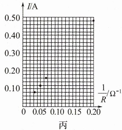 (3)为了更精确地描述I与R的关系,在表中增加了$\frac{1}{R}$的数据,并根据I、$\frac{1}{R}$的值在图丙 的坐标纸中描出了相应的点,请你在图丙中补充第4次的实验数据点,并作出I-$\frac{1}{R}$图像。