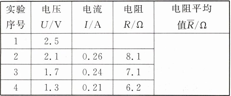 |实验序号|电压 U/V|电流 I/A|电阻 R/Ω|电阻平均值$\overline{R}/Ω$|