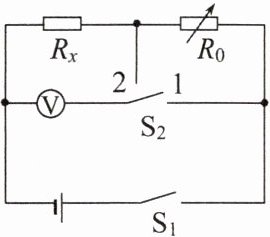 。将开关$S_{2}$拨到触点2,电压表示数为$U_{2}$,则待测电阻的阻值$R_{x}= $$\frac{U_{2}R_{0}}{U_{1}-U_{2}}$