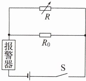 9.(物理学与日常生活)在城市交通中,电动自行车超载行驶会严重影响行车安全。为此,学校物理兴趣小组设计了一个简易超载报警系统,其原理图如图所示,当通过报警器的电流达到或超过0.4 A时,报警器(其电阻不计)将自动报警。电路中的电源电压为6 V,定值电阻$R_{0}= 60\space \Omega$,元件R的阻值与其所受压力F的关系为$R= 60-0.04F(\Omega )$。当$F= 0\space N$时,通过R的电流为______