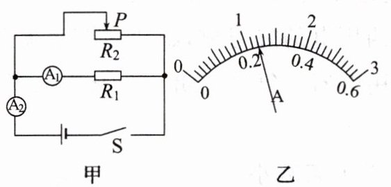 12. 在如图甲所示的电路中,电源电压不变,电阻$R_{1}$的阻值为20 Ω,闭合开关S,电流表$A_{1}和A_{2}$的示数分别为0.6 A、1 A。求: