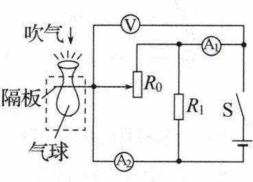7.(2024·德阳中考)2024年3月,德阳市青少年科技创新代表队在第38届四川省青少年科技创新大赛中取得优异成绩。如图所示是本次大赛我市青少年科技创新小组自制的肺活量比较装置,通过观察电流表示数的变化即可比较肺活量的大小;R₀为滑动变阻器$,R_1$为定值电阻,电压表、电流表为理想电表,电源电压保持不变。现闭合开关S,科技创新小组成员向装置吹气,隔板向上平移,滑动变阻器R₀接入电路的阻值变小,下列说法正确的是(