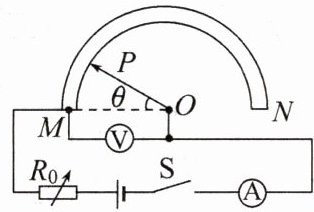 6.(2024·宿迁中考)新房装修时,工人经常用普通量角器测量一些角度,不方便读数。小明根据所学的知识设计了电子量角器,电路如图所示,电流表的测量范围为0~0.6A,电压表的测量范围为0~3V,O为半圆弧电阻MN的圆心,金属滑片OP为半径,与半圆弧接触良好,接入电路的电阻R_MP与指针旋转角度θ成正比,电源电压恒为6V,R₀为电阻箱。将滑片OP旋转至M处,调节R₀的阻值,使电路中电流为0.6A。