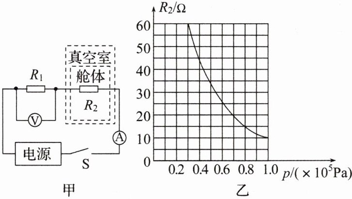 7.(物理学与工程实践)飞船在发射前,科技人员设计了如图甲所示的模拟检测电路来检验飞船舱体的气密性。电源电压不变,定值电阻$R_1= 100Ω,R_2$为压力传感器,其阻值随环境气压的变化规律如图乙所示,将$R_2$置于舱体中,舱体置于真空室中。舱体不漏气时,舱体内气压为$1.0×10^5Pa,$此时电压表示数为20V。舱体不漏气时,求: