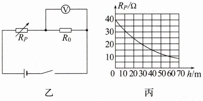 (1)由图乙可知,该电路为R₀和R_P的串联电路,电压表测R₀两端的电压;深度表在水面上时,即h=0m时,由图丙可知,此时R_P=40Ω,由串联电路的电阻特点和欧姆定律可知电路中的电流为:I=U/R_总=U/(R₀+R_P)=6V/(15Ω+40Ω)≈0.1A;