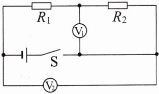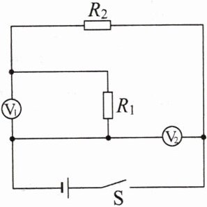 2.如图所示电路中,电源电压保持不变,定值电阻$R_{1}= 30\ \Omega$,$R_{2}= 10\ \Omega$,则闭合开关S后,电压表$V_{1}和V_{2}$的示数之比为