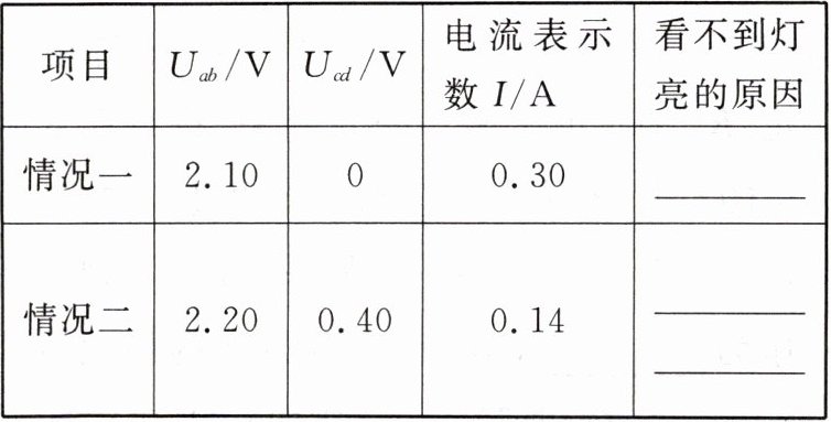|项目|$U_{ab}/V$|$U_{cd}/V$|电流表示数I/A|看不到灯亮的原因|
