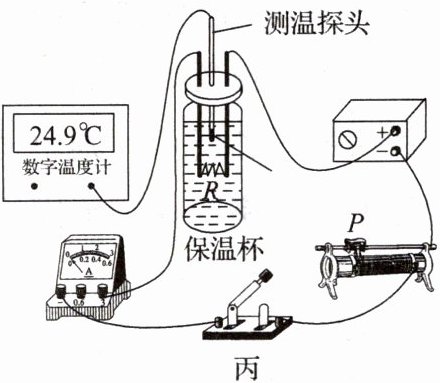 (4)(装置创新)小阳连接了如图丙所示的电路来探究电热与电流大小是否有关,其中保温杯中装有质量一定的煤油、阻值一定的电阻丝R和数字温度计的测温探头,他利用该电路及秒表进行实验。请你写出简要实验步骤:
