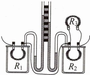8. 如图所示,已知定值电阻$R_1= R_2= R_3= 10 Ω,$则此装置可探究电阻产生的热量与