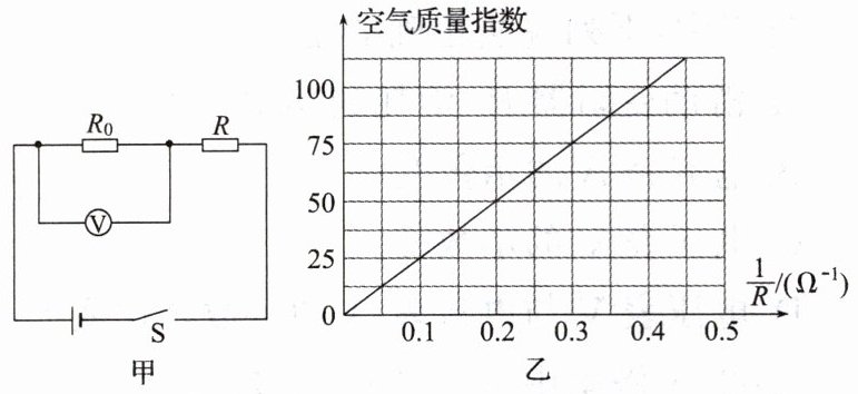 (3)此时气敏电阻两端的电压:U_R=U-U₀=6 V-3 V=3 V;由 I=$\frac{U}{R}$可得此时气敏电阻的阻值:R=$\frac{U_R}{I_R}$=$\frac{3\ \text{V}}{0.3\ \text{A}}$=10 Ω,所以$\frac{1}{R}$=$\frac{1}{10\ \Omega}$=0.1 Ω⁻¹;由图像乙可知,此时空气质量指数为 25。