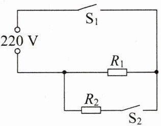 10. (2024·自贡中考)如图所示是一款有两个挡位的挂烫机的工作电路图,正常工作电压为220 V,加热电阻$R_1= 44 Ω,R_2= 88 Ω,$只闭合开关$S_1$时,挂烫机的功率是