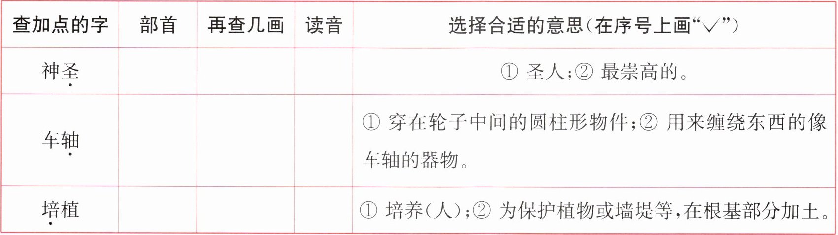 |查加点的字|部首|再查几画|读音|选择合适的意思(在序号上画“√”)|
