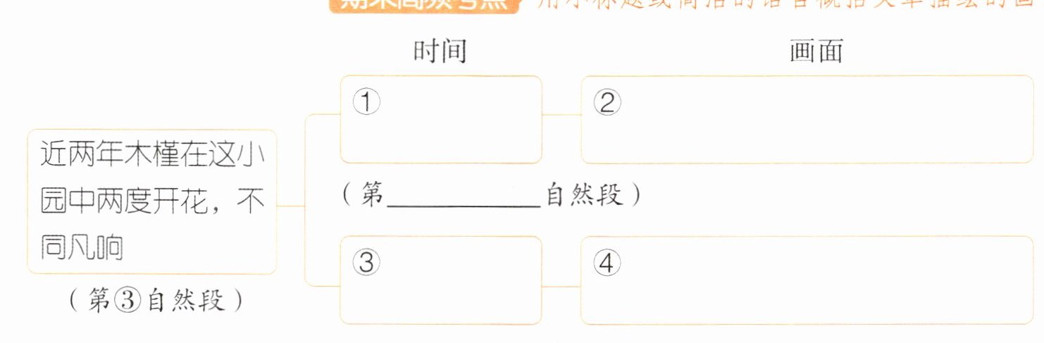 | 近两年木槿在这小园中两度开花,不同凡响(第③自然段) | 时间 | ①______ | 画面 | ②______(第______自然段) |
