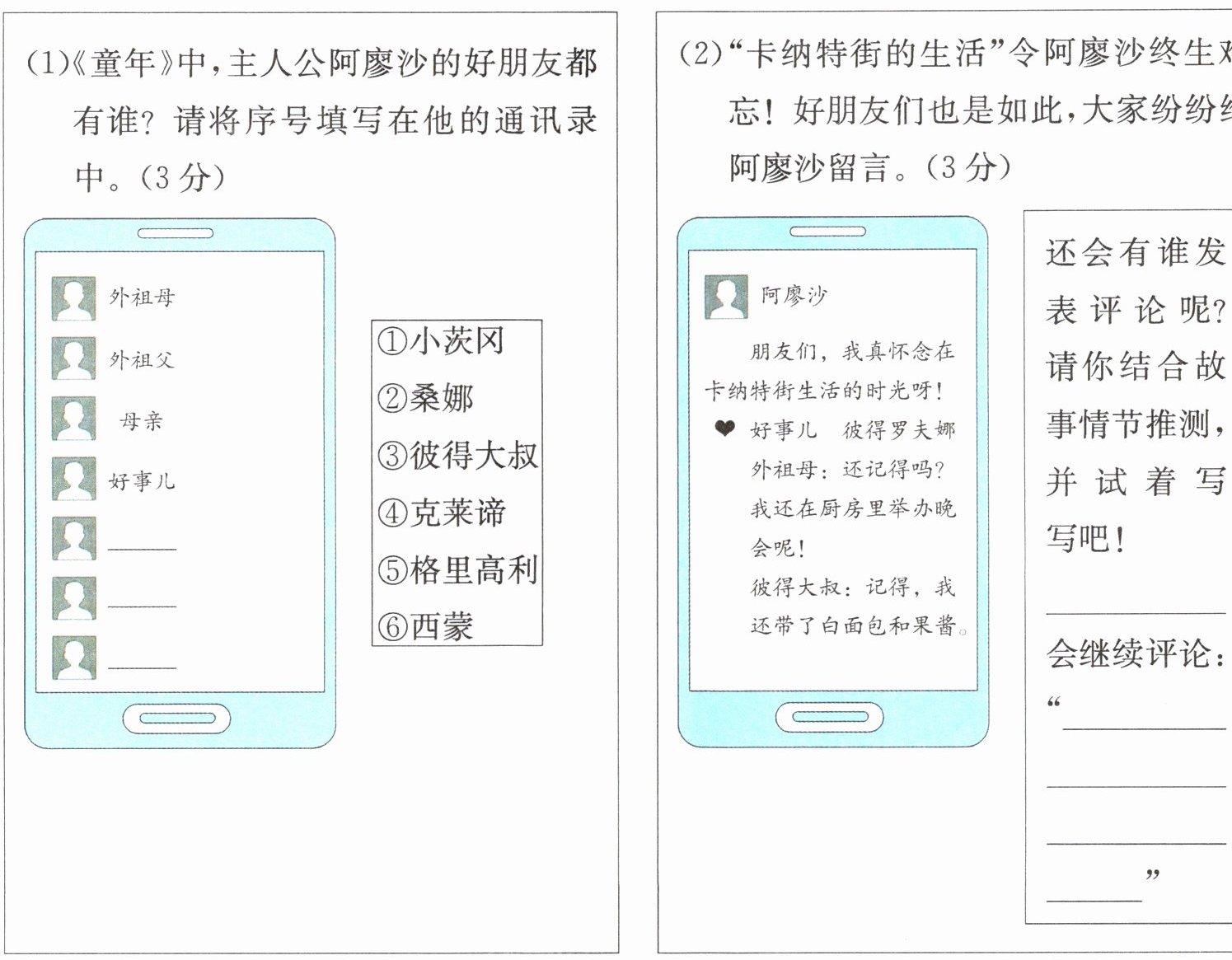 (1)《童年》中,主人公阿廖沙的好朋友都有谁?请将序号填写在他的通讯录中。(3分)