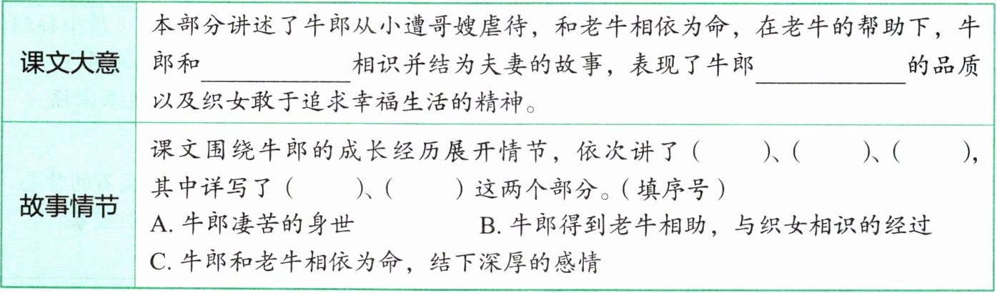 | 故事情节 | 课文围绕牛郎的成长经历展开情节,依次讲了(______)、(______)、(______),其中详写了(______)、(______)这两个部分。(填序号)A. 牛郎凄苦的身世B. 牛郎得到老牛相助,与织女相识的经过C. 牛郎和老牛相依为命,结下深厚的感情 |