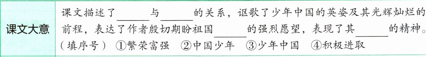 | 课文大意 | 课文描述了______与______的关系,讴歌了少年中国的英姿及其光辉灿烂的前程,表达了作者殷切期盼祖国______的强烈愿望,表现了其______的精神。(填序号)①繁荣富强 ②中国少年 ③少年中国 ④积极进取 |