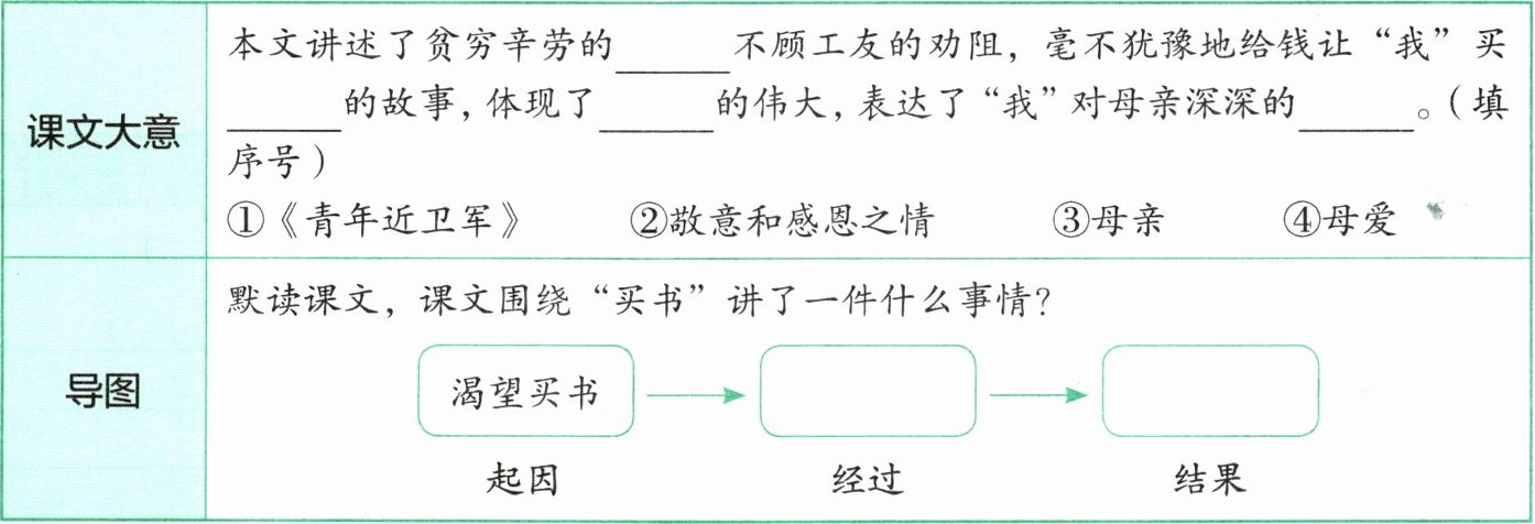 | 导图 | 默读课文,课文围绕“买书”讲了一件什么事情?渴望买书(起因)→ ______(经过)→ ______(结果) |