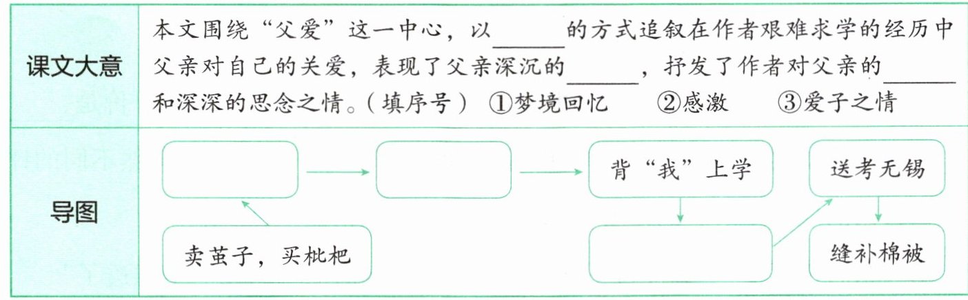 | 课文大意 | 本文围绕“父爱”这一中心,以______的方式追叙在作者艰难求学的经历中父亲对自己的关爱,表现了父亲深沉的______,抒发了作者对父亲的______和深深的思念之情。(填序号)①梦境回忆 ②感激 ③爱子之情 |