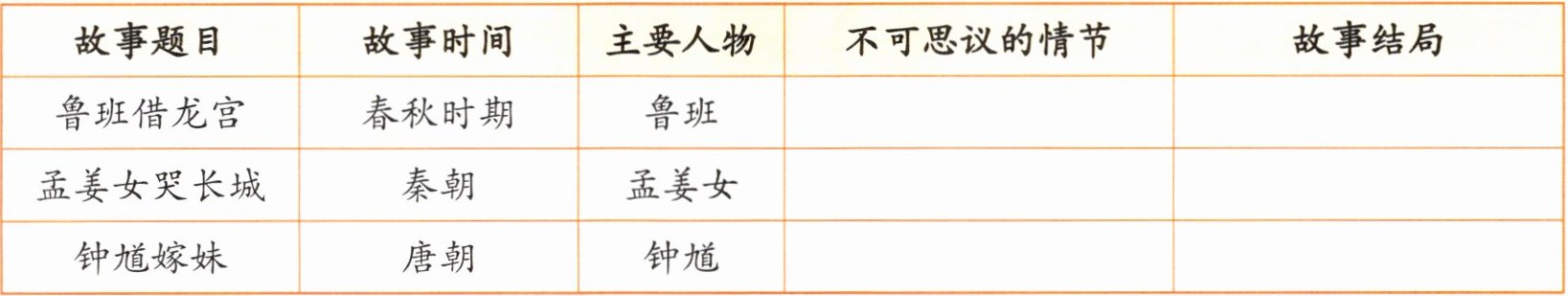 1.第一行:鲁班向东海龙王借宫殿 鲁班建成了比龙宫更壮观气派的房屋 第二行:孟姜女哭倒长城 孟姜女投海而死,人们在山海关盖了孟姜女庙 第三行:钟馗的冤魂救了皇上性命 钟馗带领众鬼为妹妹送嫁 都有不可思议的情节和出人意料的结局