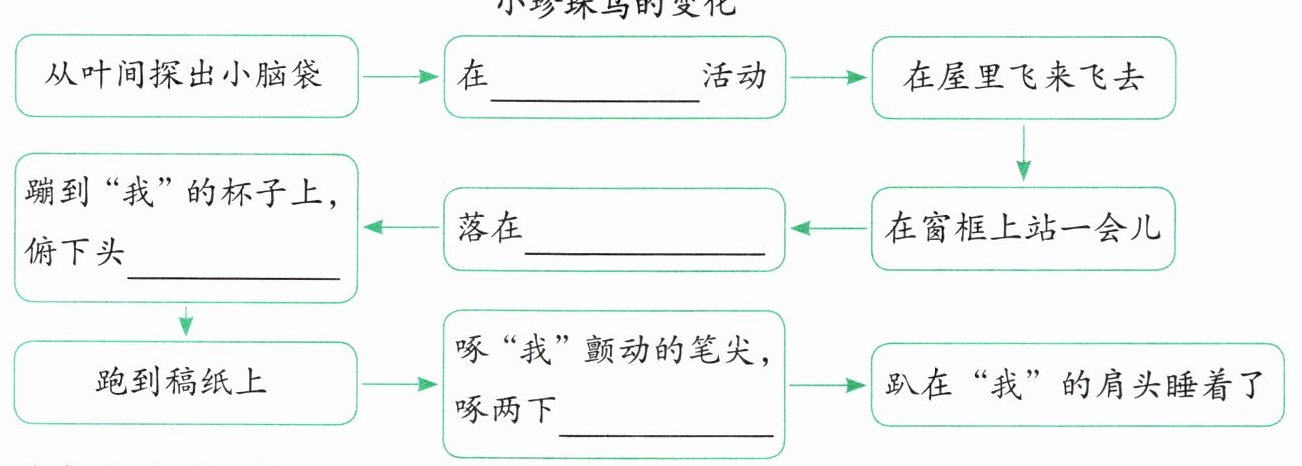 | 跑到稿纸上 | → | 啄“我”颤动的笔尖,啄两下______ | → | 趴在“我”的肩头睡着了 |