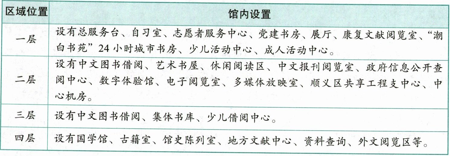 | 二层 | 设有中文图书借阅、艺术书屋、休闲阅读区、中文报刊阅览室、政府信息公开查阅中心、数字体验馆、电子阅览室、多媒体放映室、顺义区共享工程支中心、中心机房。 |
