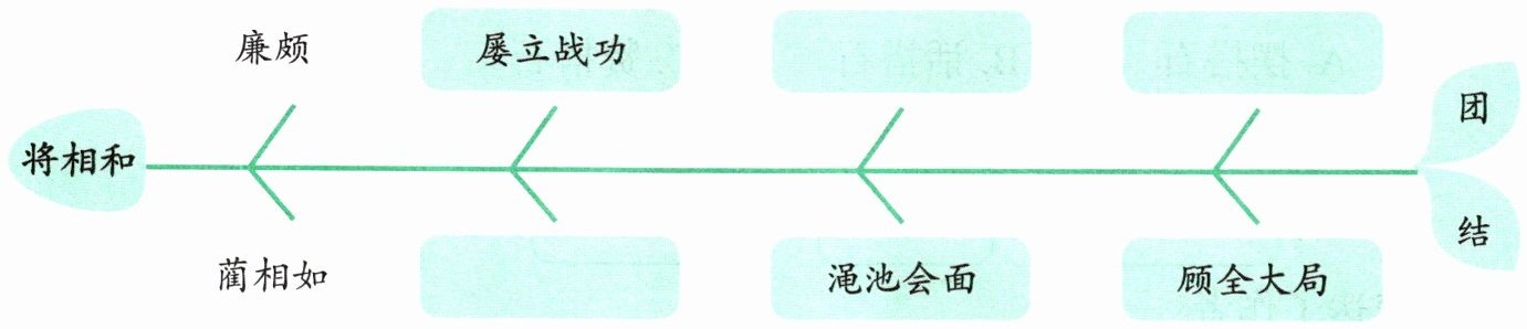 $\boxed{将相和}\begin{cases} \boxed{廉颇}\begin{cases} \boxed{屡立战功} \\ \boxed{$_________$} \\ \boxed{$_________$} \end{cases} \\ \boxed{蔺相如}\begin{cases} \boxed{$_________$} \\ \boxed{渑池会面} \\ \boxed{顾全大局} \end{cases} \end{cases}\rightarrow\boxed{团结}$