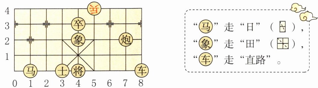 (3)“车”先向上走到(8,4)的位置,再向左走到(5,4)的位置,就能吃掉“兵”。 (答案不唯一)