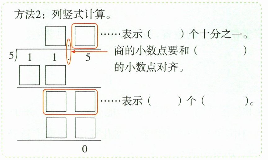 2.3 115 115 23 23 2.3 $\begin{array}{r}2\boxed{3}\\5\enclose{longdiv}{11.5}\\10\quad\\\hline15\\15\\\hline0\end{array}$……表示(3)个十分之一。商的小数点要和(被除数)的小数点对齐。……表示(15)个(十分之一)。