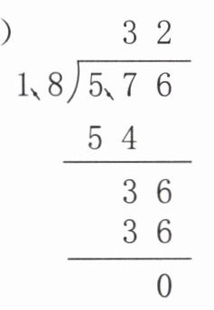 (1)$\begin{array}{r} 3\ 2\\ 1.8\enclose{longdiv} {5.7\ 6}\\ 5\ 4\\ \hline 3\ 6\\ 3\ 6\\ \hline 0\end{array} $ 改正: