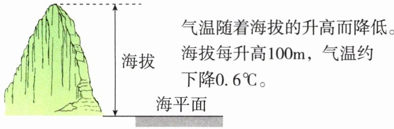 气温随着海拔的升高而降低。海拔每升高100m,气温约下降0.6℃。