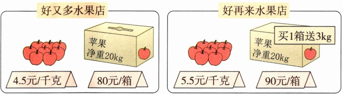 80+(25-20)×4.5=102.5(元) 90+(25-20-3)×5.5=101(元) 101<102.5 在好再来水果店买便宜,一共需要101元。 解析:在好又多水果店买25kg苹果,需要买一箱加5kg;在好再来水果店买25kg苹果,需要买一箱(送3kg)加2kg。先分别求出在这两家水果店各买25kg苹果需要的钱数,再比较哪家便宜,从而判断一共需要花的钱数。