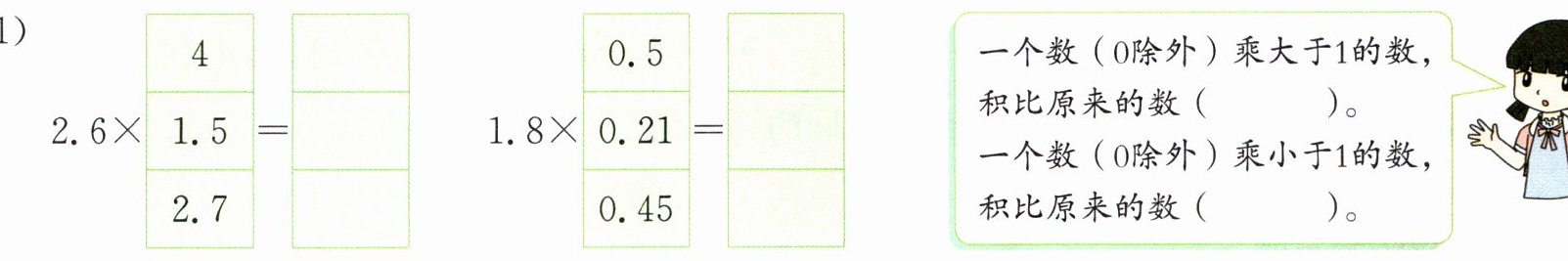 (1)计算$1.2×0.9$时,先按照整数乘法算出( )×( )的积,再点小数点,结果是( )。