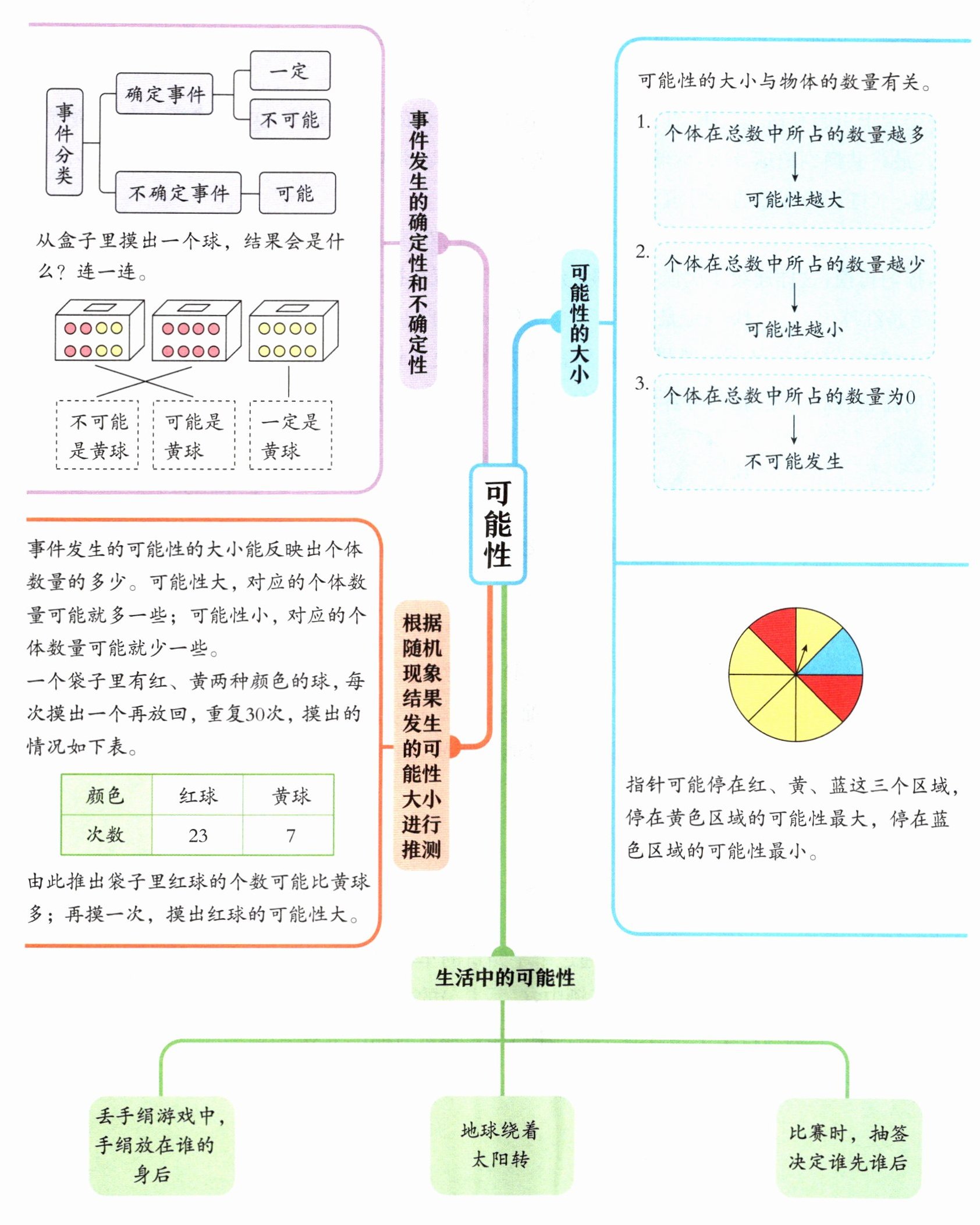 解析:题目考查事件发生的确定性和不确定性、可能性的大小及其与物体数量的关系。通过连线题和实际摸球实验数据,判断事件发生的可能性(不可能、可能、一定),并理解可能性大小与物体数量的关联。