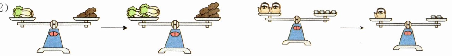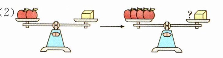 (2)2个苹果或1个正方体 解析:根据等式的性质1,左边添加2个苹果,右边也应该添加2个苹果,或根据等式的性质2,左边苹果的数量扩大到原来的2倍,右边正方体的数量也要扩大到原来的2倍,即右边应该添加1个正方体。